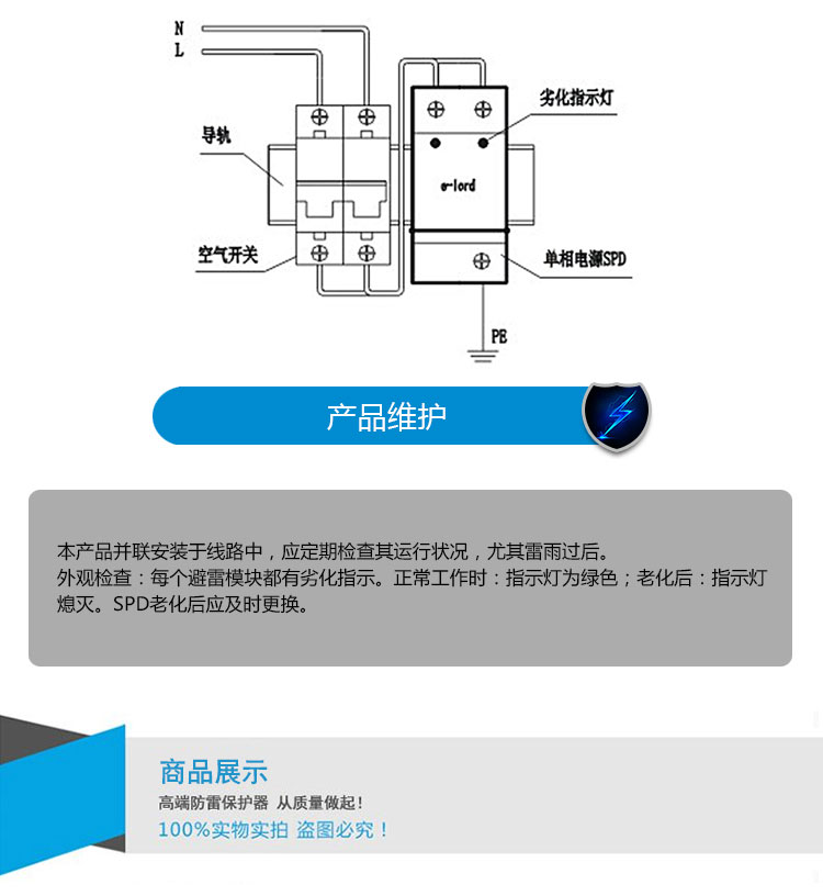 1. 已有可靠接地系統(tǒng),在配電柜(避雷器安裝處)的接地樁 (條)上進(jìn)行接地電阻的測定,電阻應(yīng)符合相關(guān)規(guī)范要求。 (或滿足國家、部級標(biāo)準(zhǔn))。 2. 配電柜中應(yīng)留有安裝避雷器的空間, 注:L為電源相線;N為電源零線;PE為地線。 | 應(yīng)檢查空氣開關(guān)已經(jīng)合閘導(dǎo)通,以保證避雷器處于運(yùn)行狀態(tài); 不要在雷雨天安裝。 |